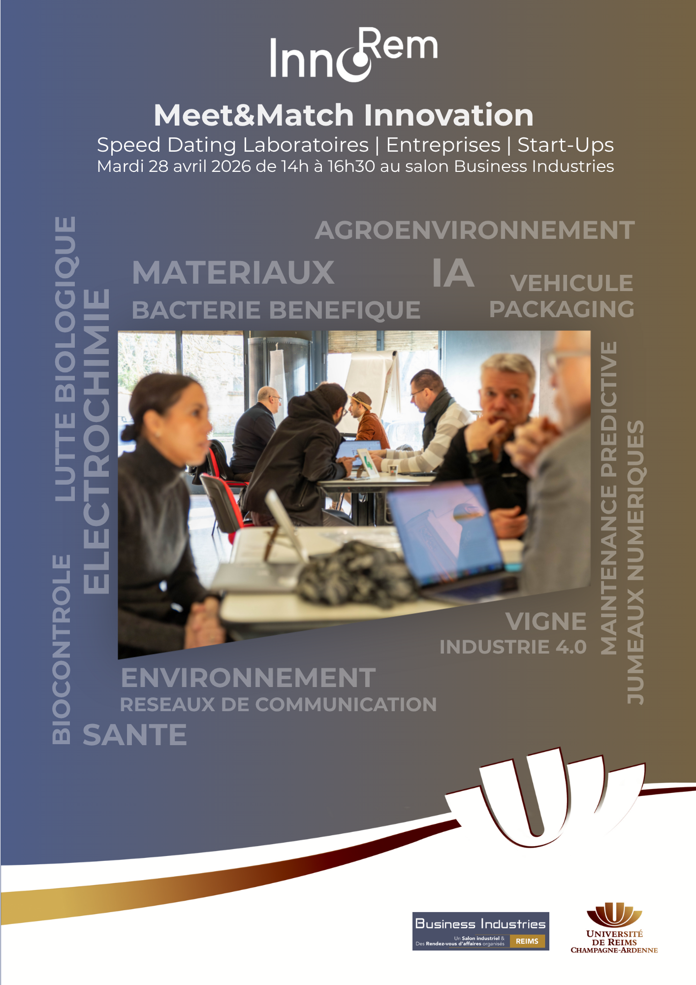 L’Université de Reims Champagne-Ardenne, à travers son Pôle Universitaire d’Innovation InnoRem, vous invite à participer à son événement Meet & Match Innovation, organisé dans le cadre du Salon Business Industries, le mardi 28 avril de 14h à 16h30 dans le bureau de l'espace rencontres.